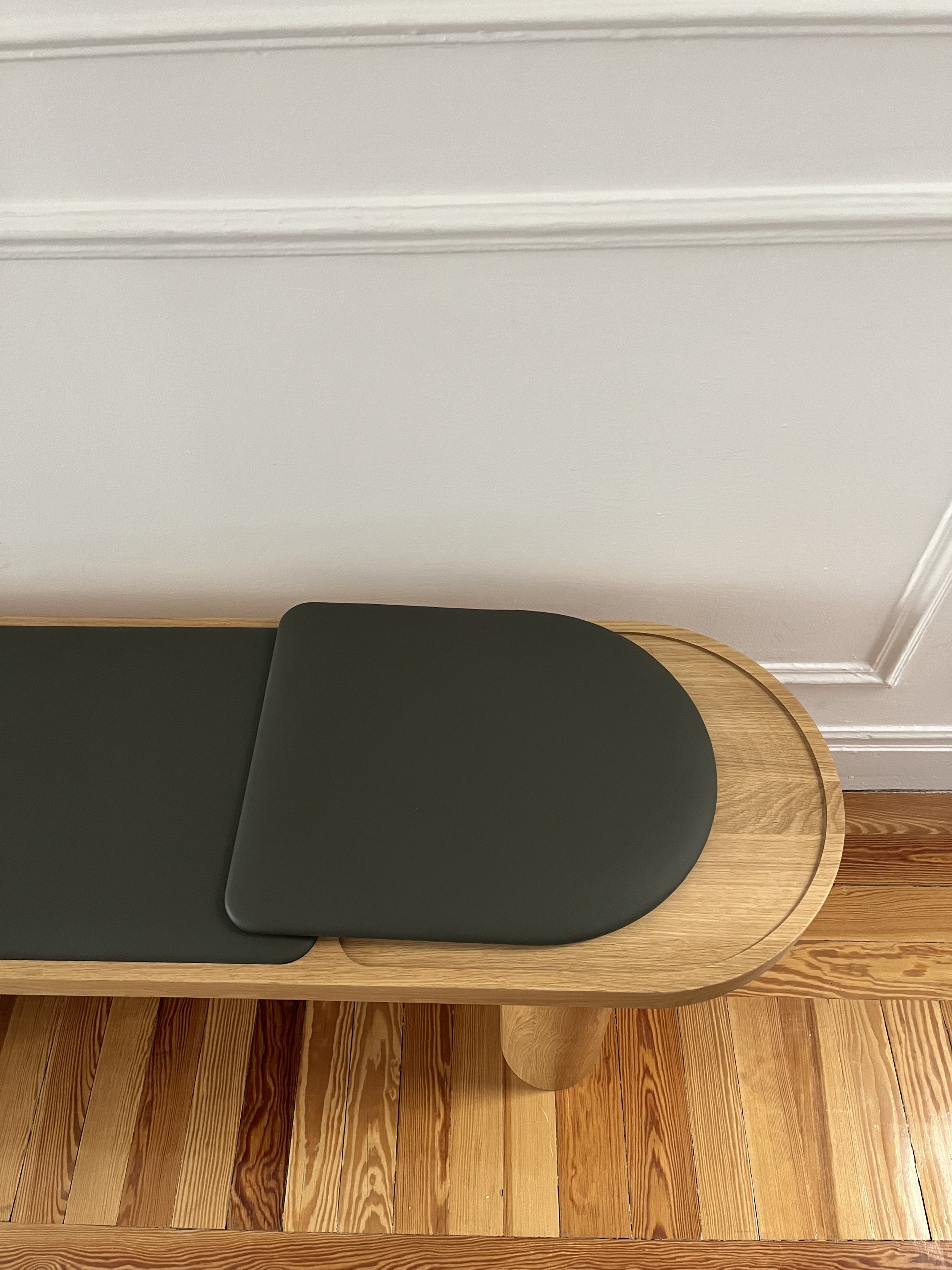 This piece is their artisan-crafted solid oak bench, a testament to timeless craftsmanship and comfort. Handmade with precision and care, this solid oak boasts elegant rounded legs and comes adorned with bespoke cushions, adding both style and coziness to any space. The cushions in green can be dettached and reupholstered as desired.